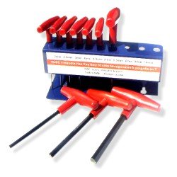 Metric 10 piece T-Handle Hex Key Wrench Set Heat treated chrome vanadium steel, black oxide finish, T-handle design increases turning power and provides a sure comfortable grip, Contoured plastic T-handles, Wrench length: 5-1/2" to 6", Sizes: 2 mm, 2.5 mm, 3 mm, 4 mm, 4.5 mm, 5 mm, 5.5 mm, 6 mm, 8 mm, 10 mm